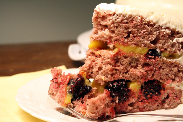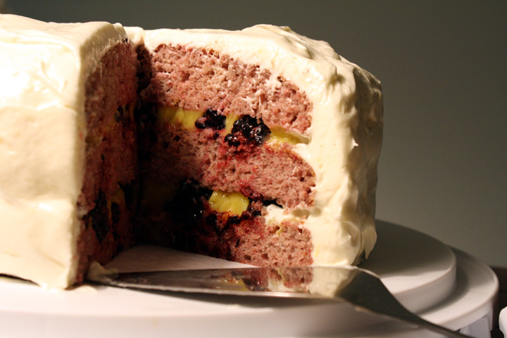 I kind of combined the two and made a raspberry cake (I think he wouldn’t have minded the seeds are baked in but you could easily strain them out), with lemon curd filling and a cream cheese frosting. There were no good blueberries so I used blackberries in this filling.