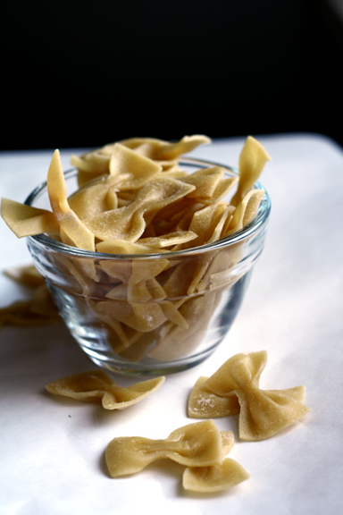 With the rectangle’s long side facing you, put your pointer finger of one hand in the center of the rectangle. Using your other hand, pinch the middle sides of the long edges of dough together, towards the center and your finger. Release your finger from center of dough as you pinch together so the pasta meets the other side. Pinch hard enough for it to stay shaped. *If you’re visual and need a tutorial for the bowtie-forming, visit http://www.pasta-recipes-made-easy.com/farfalle-pasta.html.