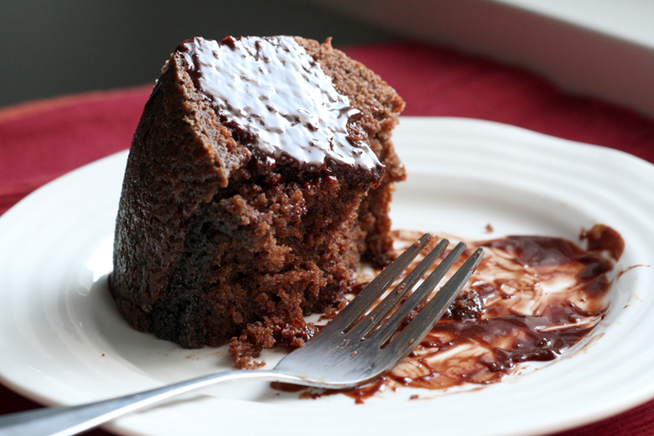I was anxious to take a pic and eat this, so I didn’t give the glaze a chance to thicken to a good consistency. If you want to have it oozing down the sides of the cake, you should put it in the fridge for at least 30 minutes. I didn’t have time for that so I cut a slice and just poured the thinner version of the sauce over it…equally tasty but not as pretty.