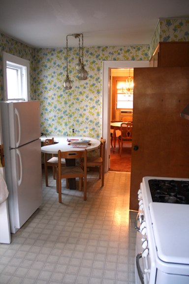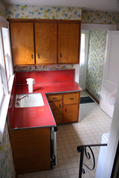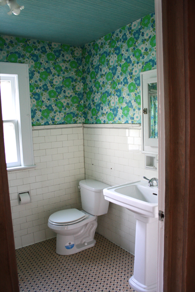 Come walk across the hall and check out the existing bathroom. Please try not to be jealous of the wallpaper ;) The sink is actually in really good shape so I’m thinking maybe I can reuse it in the guest bath upstairs: