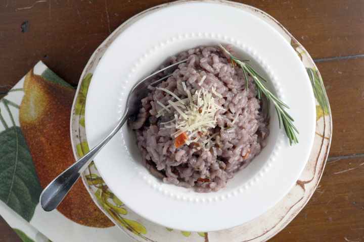 Do you happen to have some red wine lying around? If Nate was home I wouldn’t, since the man loves some red wine…but he’s not, and I happened to have some red wine leftover from the bolognese I made last week. Since I’m not a drinker or a waster, I had to find another use for it! After doing a little search for recipes using red wine, I settled upon risotto.