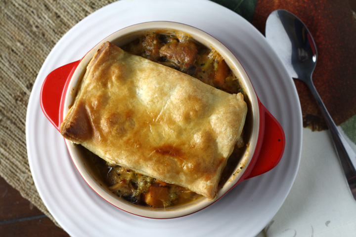 Place mixture in serving dish(es). I used individual ramekins for portion control, but it should fit in a 9×13 pan. Cut puff pastry into 8 pieces and place one on each portion.