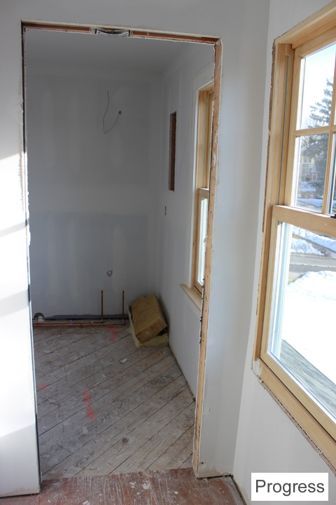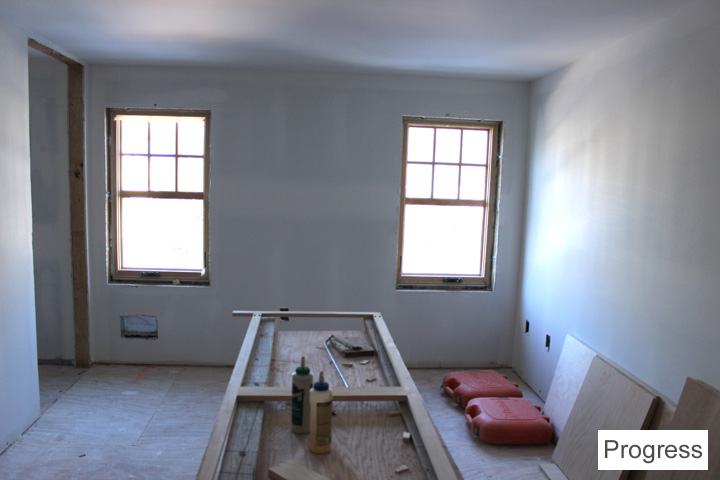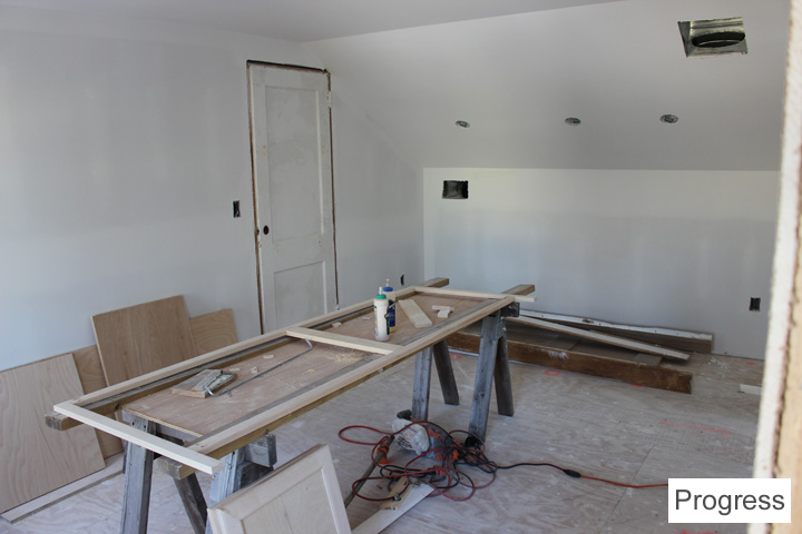 and here’s the bookcase/desk being built, plus some trim on the windows/doors: