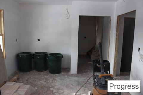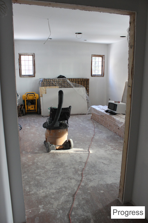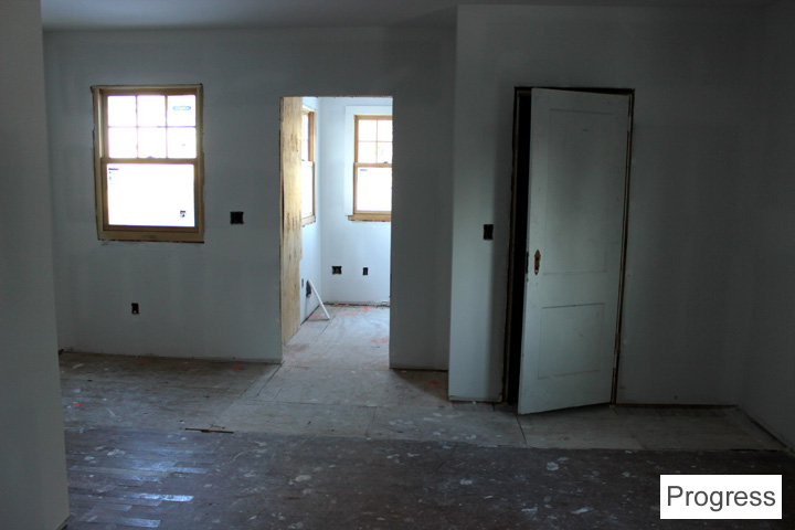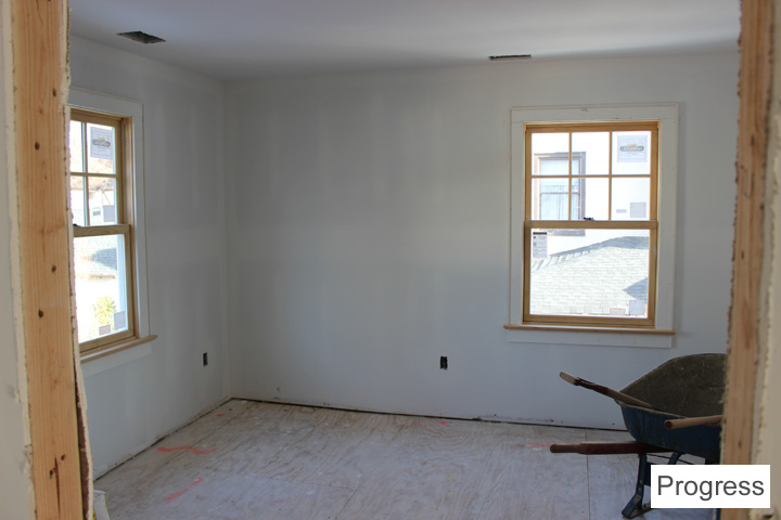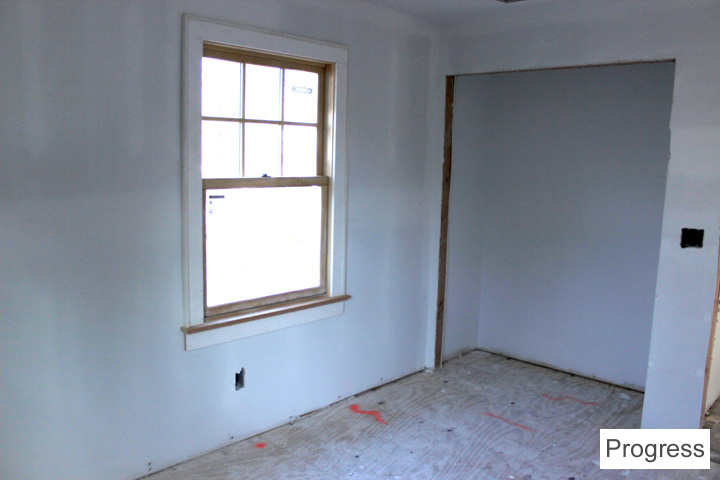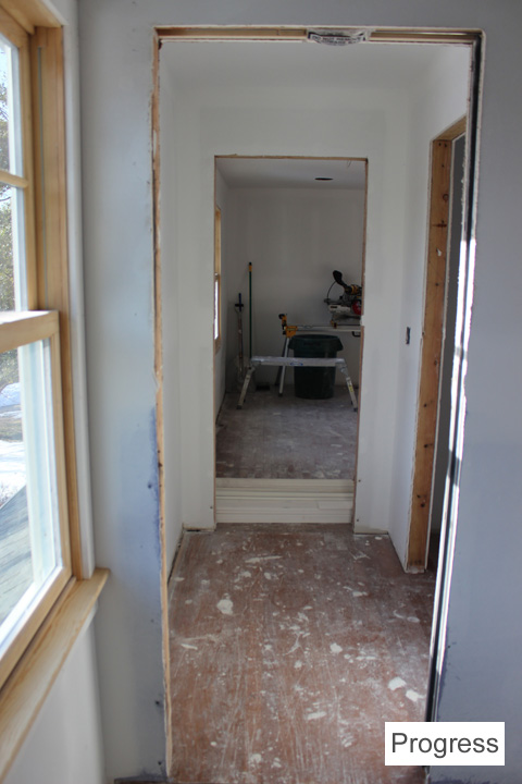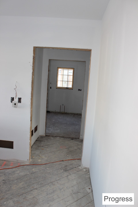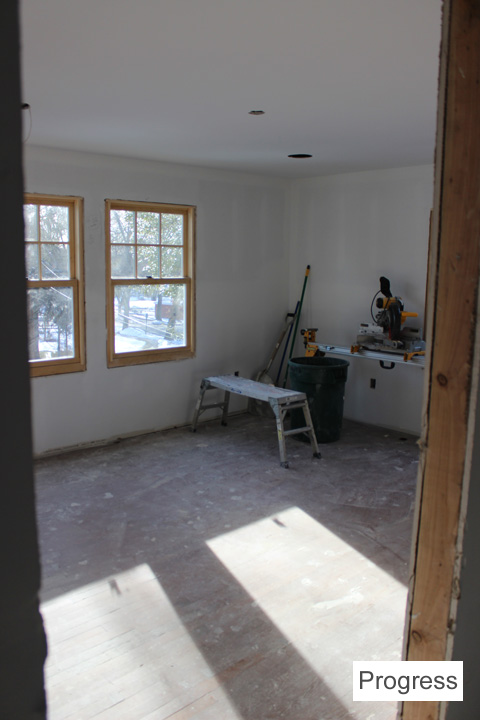 There is going to be a wood mantle surround and cabinets around the fireplace. They’re in the process of being built. The living room is smaller now because there’s a front hall closet and built-in desk/bookcase on the living room side.