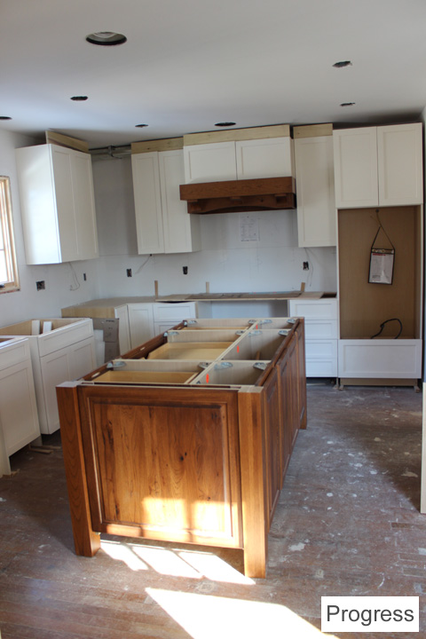 Here’s a pic of the kitchen partially assembled…but this is with the incorrect, too-big island: