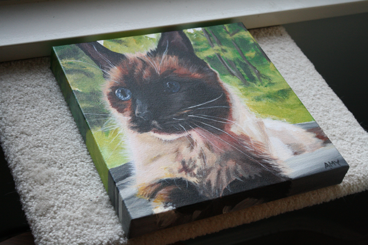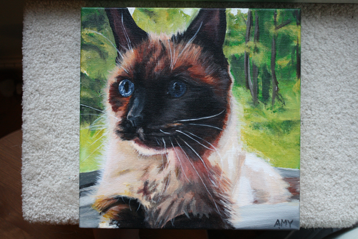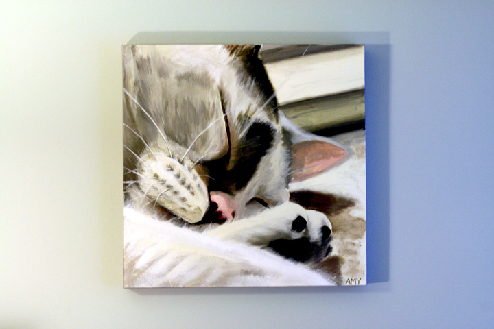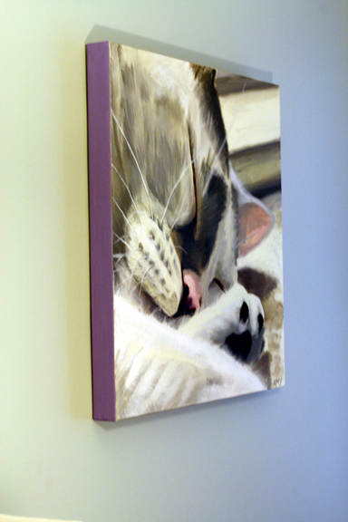 I’m available to create a unique painting for you based on a photo of your pet that you think best captures his/her personality. I do both dogs and cats, and any other animal you have in mind! I just need a good photo to work from.