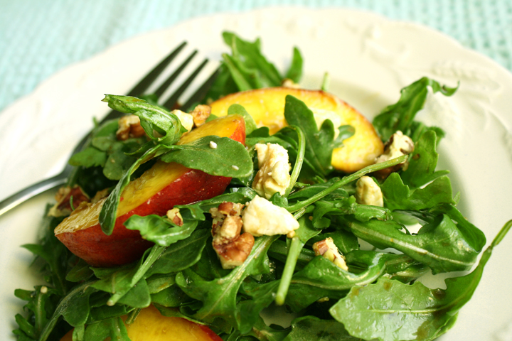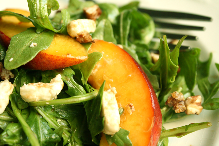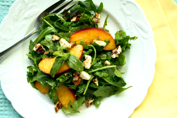 Arugula Salad with Peaches, Goat Cheese, Mint, and Candied Pecans