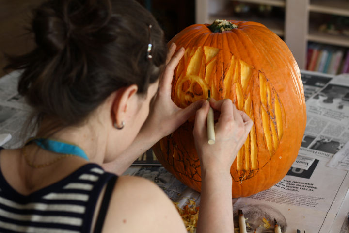 - I don’t actually ever cut all the way through the pumpkin flesh- the light areas are simply scraped quite deep into the flesh.