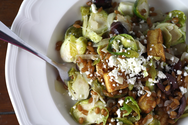 Warm Wheatberry Brussels Sprout Salad with Feta cheese and Crispy Tofu