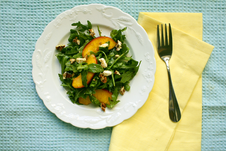 Arugula Salad with Peaches, Goat Cheese, Mint, and Candied Pecans