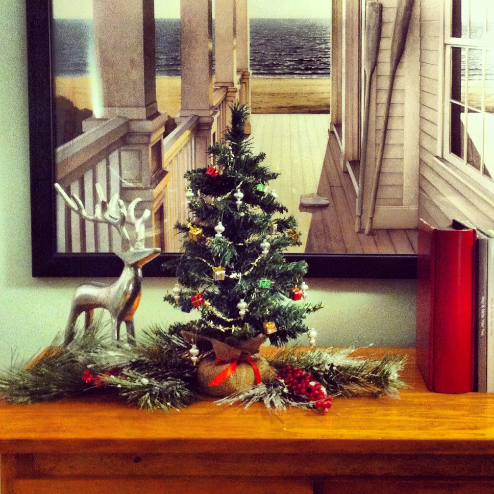 We have a tiny apartment and a michievous feline, so we knew we couldn’t get a full-fledged Christmas tree yet. Instead we went to Michael’s to see what we could find. We ended up getting the cutest miniature tree and there were all kinds of mini ornaments and garlands you could get to decorate it!!! Btw, I love anything in miniature. We also picked up a silver reindeer from Home Goods and I broke up some branches to make a little festive setting on our living room mantle dresser.